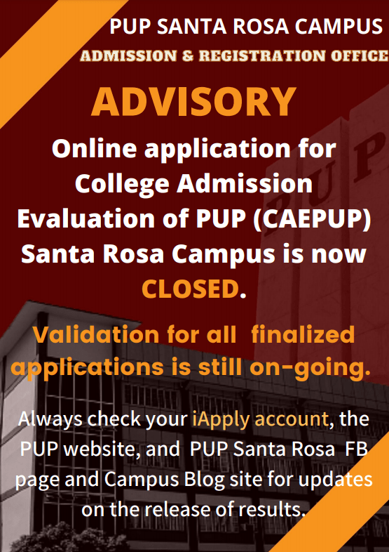Online application for College Admission Evaluation of PUP (CAEPUP) Santa Rosa Campus is now CLOSED.