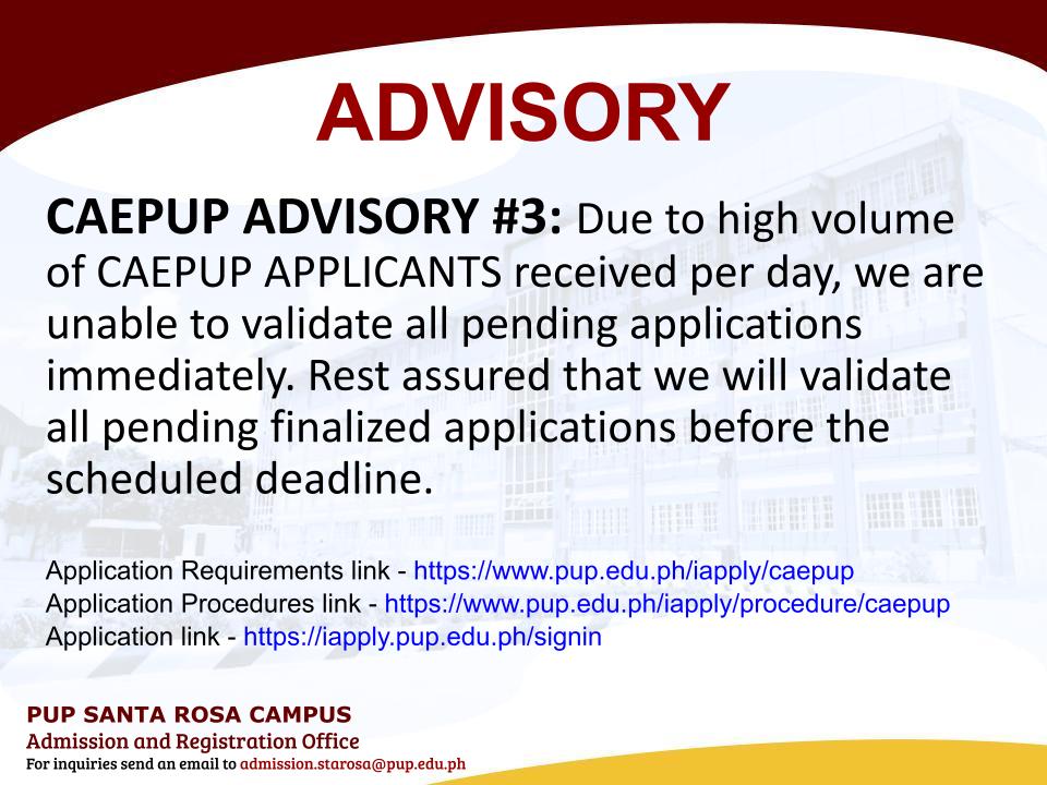 Due Internet connectivity issues and high volume of CAEPUP APPLICANTS received per day, we are unable to validate all pending applications immediately. Rest assured that we will validate all pending finalized applications before the scheduled deadline.