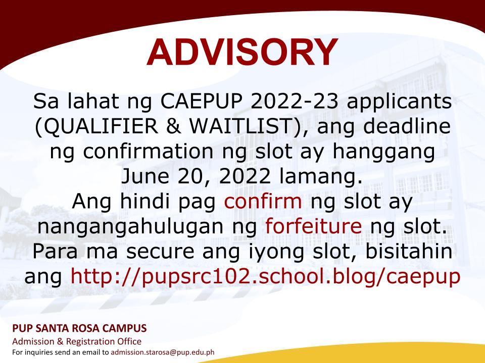 Deadline of CONFIRMATION for all QUALIFIER & WAITLISTED applicants will be on June 20, 2022. Failure to confirm means forfeiture of your slot.