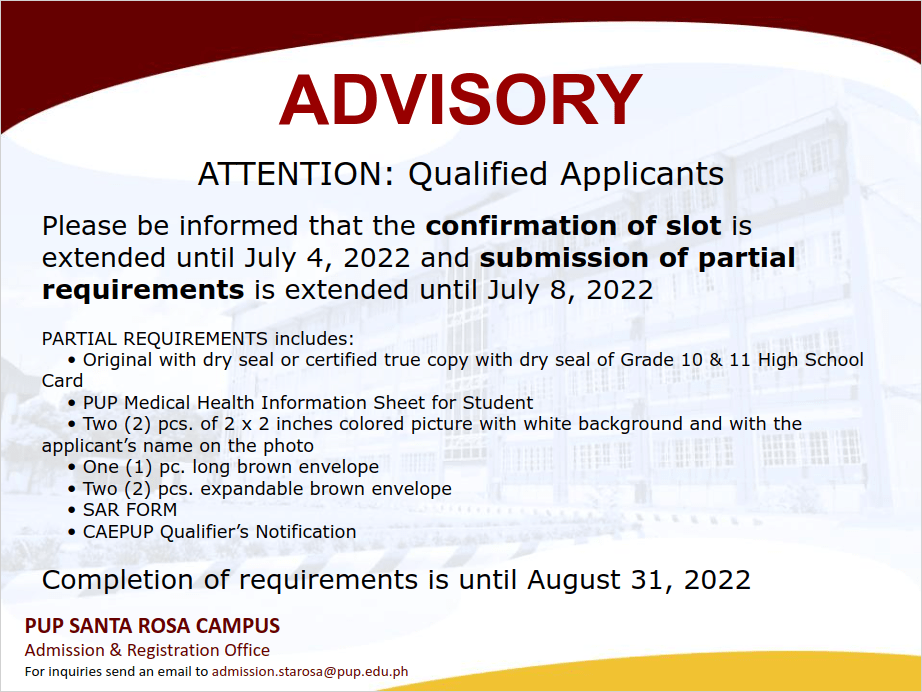 Please be informed that the confirmation of slot is extended until July 4, 2022 and submission of partial requirements is extended until July 8, 2022