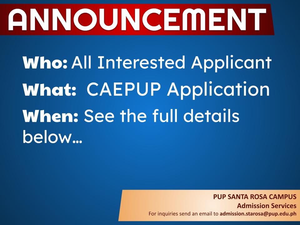 The online CAEPUP application period will start from January 30, 2023 to May 15, 2023. The last day for issuance of the application form is also May 15, 2023.
