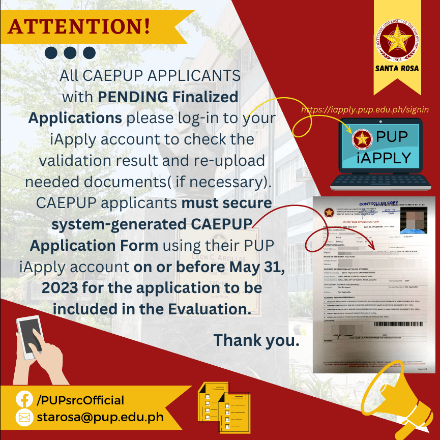CAEPUP applicants must secure system-generated CAEPUP Application Form using their PUP iApply account on or before May 31, 2023 for the application to be included in the Evaluation.