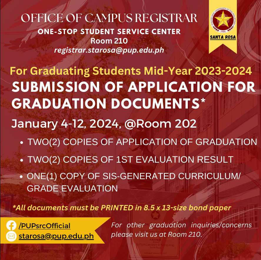 The submission of graduation documents will be from January 4-12, 2024, at Room 202.