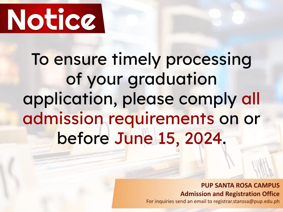 Please be advised that the students listed below must complete all outstanding admission requirements on or before June 15, 2024 to ensure timely processing of the graduation applications. Failure to comply with these requirements may result in delays in the applications process.