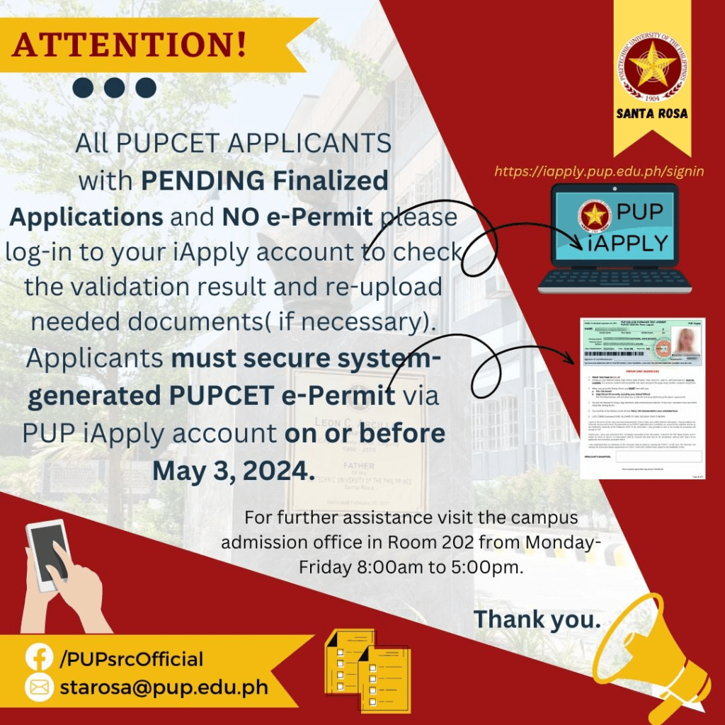 For any inquiries regarding e-Permits, we invite all applicants to visit the campus admission office to address any e-Permit-related queries or problems, or you may send us an email to PUPSRC Admission Services at admission.starosa@pup.edu.ph