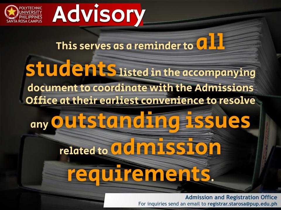 This serves as a reminder to all students listed in the accompanying document to coordinate with the Admissions Office at their earliest convenience to resolve any outstanding issues related to admission requirements.