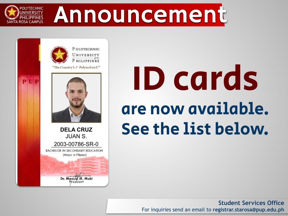 Please be advised that a new batch of identification cards is ready for distribution. ID claiming will commence on: