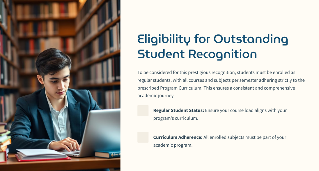 Must be a regular student (Courses/Subjects Enrolled per Semester must be prescribed by the Program Curriculum)