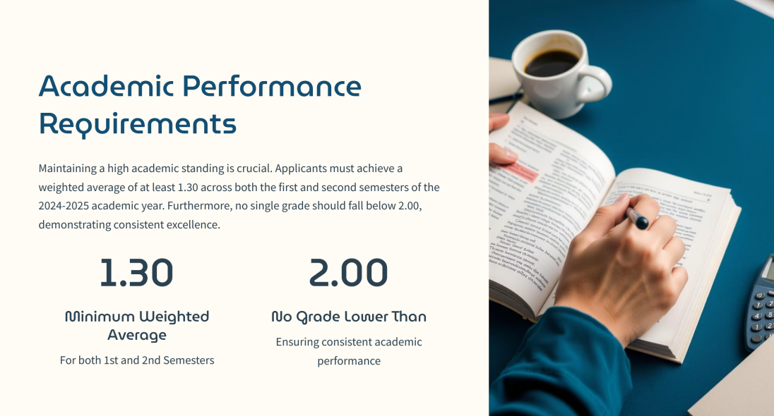 Must Have a Weighted Average of at Least 1.30 for both 1st and 2nd semesters and no grade lower than 2.00.