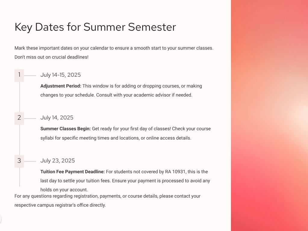 - July 23, 2025: Last Day of Payment for Tuition Fees (for students not covered by RA 10931)