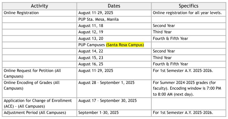 PUP Santa Rosa Campus First Semester A.Y. 2025–2026 Important Dates