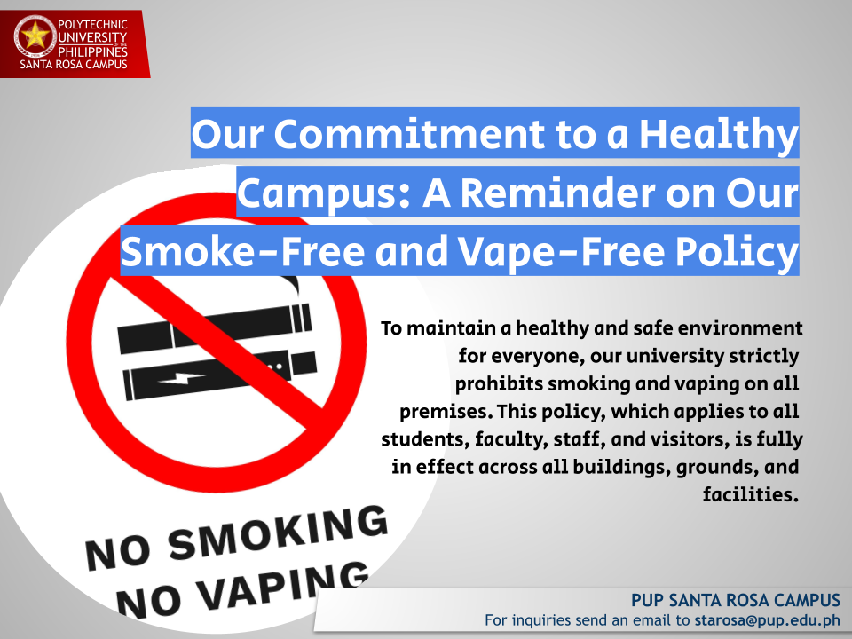 This initiative isn’t just a university rule—it’s grounded in national laws like the Clean Air Act of 1999 (Republic Act No. 8749) and the Tobacco Regulation Act of 2003 (Republic Act No. 9211). By adhering to this policy, we’re not only creating a better campus but also aligning with the country’s commitment to public health.